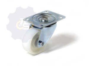 Baltas poliamido (PA) ratukas, rutulinis guolis su apsauga nuo dulkių, fiksuotas (nepasukamas) cinkuoto plieno kronšteinas (laikiklis), tvirtinimo plokštelė 100×85 mm, 4 tvirtinimo skylės – D 9 mm ovalo formos (ilgis 11.5 mm) – tvirtinimo skylių atstumas tarp centrų 80×60 mm – 75×60 mm. Rekomenduojame montavimo paviršiuje gręžti skyles atstumu 80×60 mm tarp centrų.