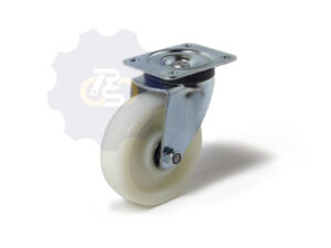 Baltas poliamido (PA) ratukas, rutulinis guolis su apsauga nuo dulkių, pasukamas cinkuoto plieno kronšteinas (laikiklis) su dvejomis eilėmis atraminių guolių, su stabdžiu (fiksuoja ratuką ir kronšteiną), tvirtinimo plokštelė 105×80 mm, 4 tvirtinimo skylės – D9 mm ovalo formos (ilgis 11 mm) – tvirtinimo skylių atstumas tarp centrų 80×60 mm – 76×60 mm. Rekomenduojame montavimo paviršiuje gręžti skyles atstumu 80×60 mm tarp centrų.