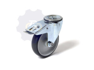 Poliuretanu (95° Shore A) dengtas ratukas su polipropileno ratlankiu, slydimo guolis (įvorė), pasukamas cinkuoto plieno kronšteinas (laikiklis) su dvejomis eilėmis atraminių guolių, tvirtinimo skylė D12.5 mm (tvirtinamas vienu varžtu M10, M12)