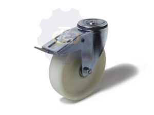 Baltas poliamido (PA) ratukas, rutulinis guolis, pasukamas cinkuoto plieno kronšteinas (laikiklis) su dvejomis eilėmis atraminių guolių, tvirtinimo skylė D12.3 mm (tvirtinamas vienu varžtu M12)
