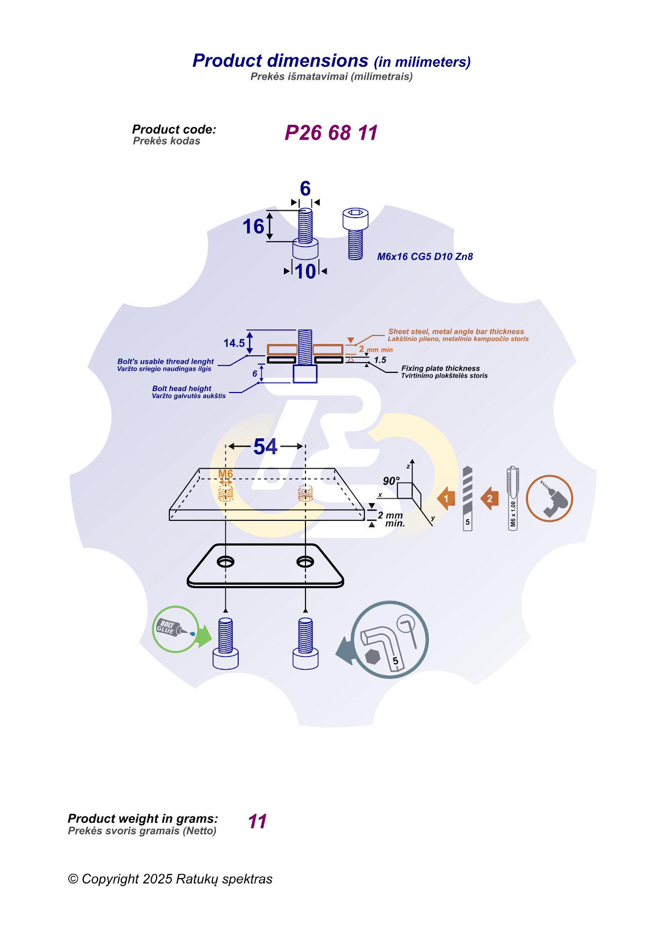 2 vienetai – M6 x 16 mm Zn8 Varžtas, cilindrine galva. Įrankis: šešiakampis L-formos 5 dydžio raktas.