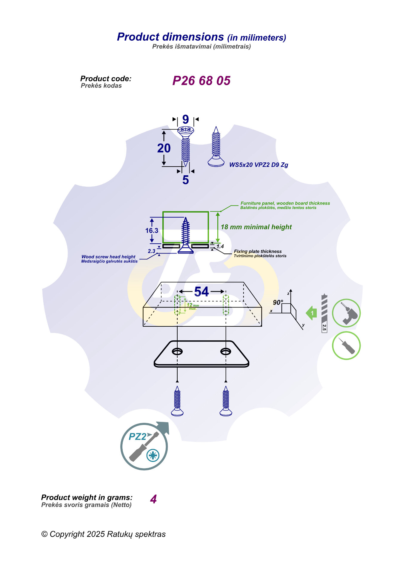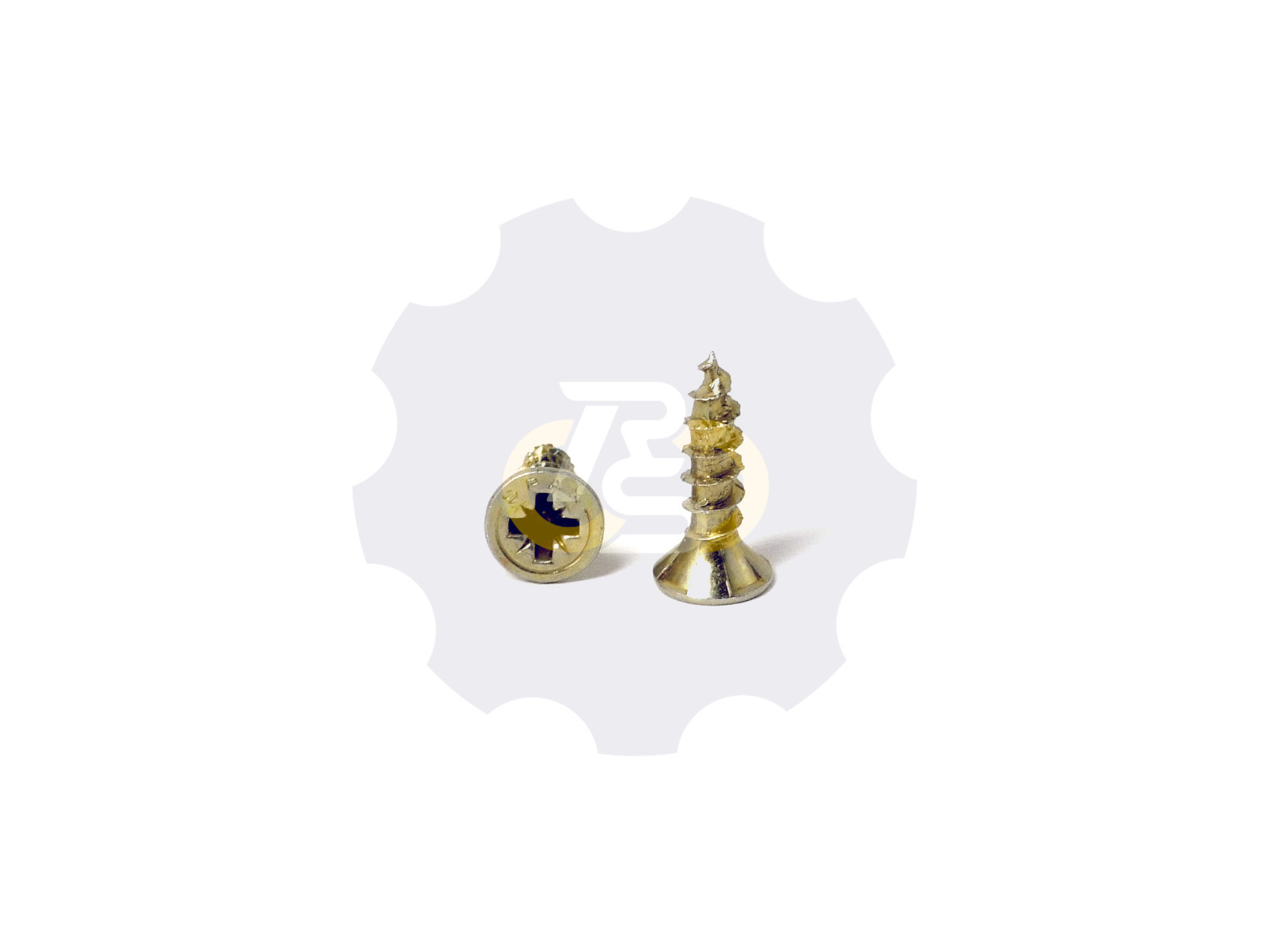 2 vienetai – WS 5 x 20 mm Zg Medsraigtis, įleidžiama galva, aukso spalva. Įrankis: atsuktuvas PZ2 galvute.