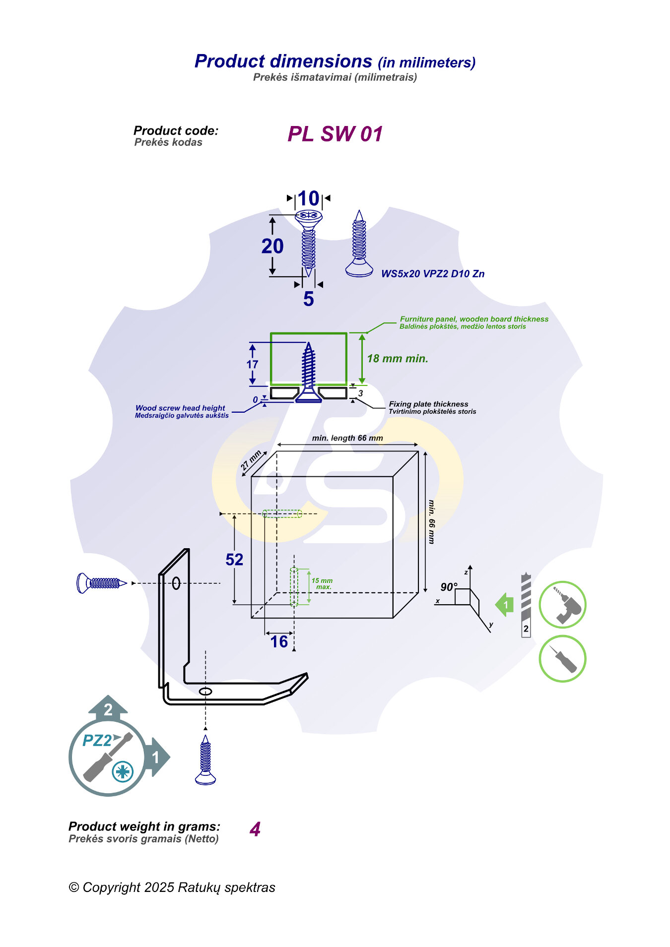 2 vienetai – WS 5 x 20 mm Zn Medsraigtis, įleidžiama galva. Įrankis: atsuktuvas PZ2 galvute.