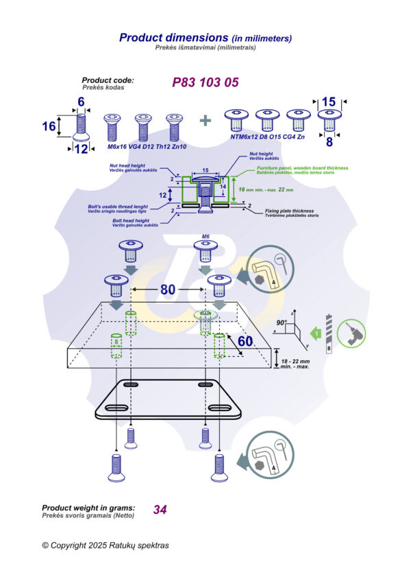4 vienetai – M6 x 16 mm Zn10 Varžtas įleidžiama galva. Sriegio ilgis 12 mm. Įrankis: šešiakampis L-formos 4 dydžio raktas. + 4 vienetai – NT M6 x 12 Zn T-formos veržlė, cinkuota, bendras aukštis 14 mm, skersmuo 8 mm. Sriegio gylis 8 mm, kepurėlės diametras 15 mm, storis 2 mm. Įrankis: šešiakampis L-formos 4 dydžio raktas.