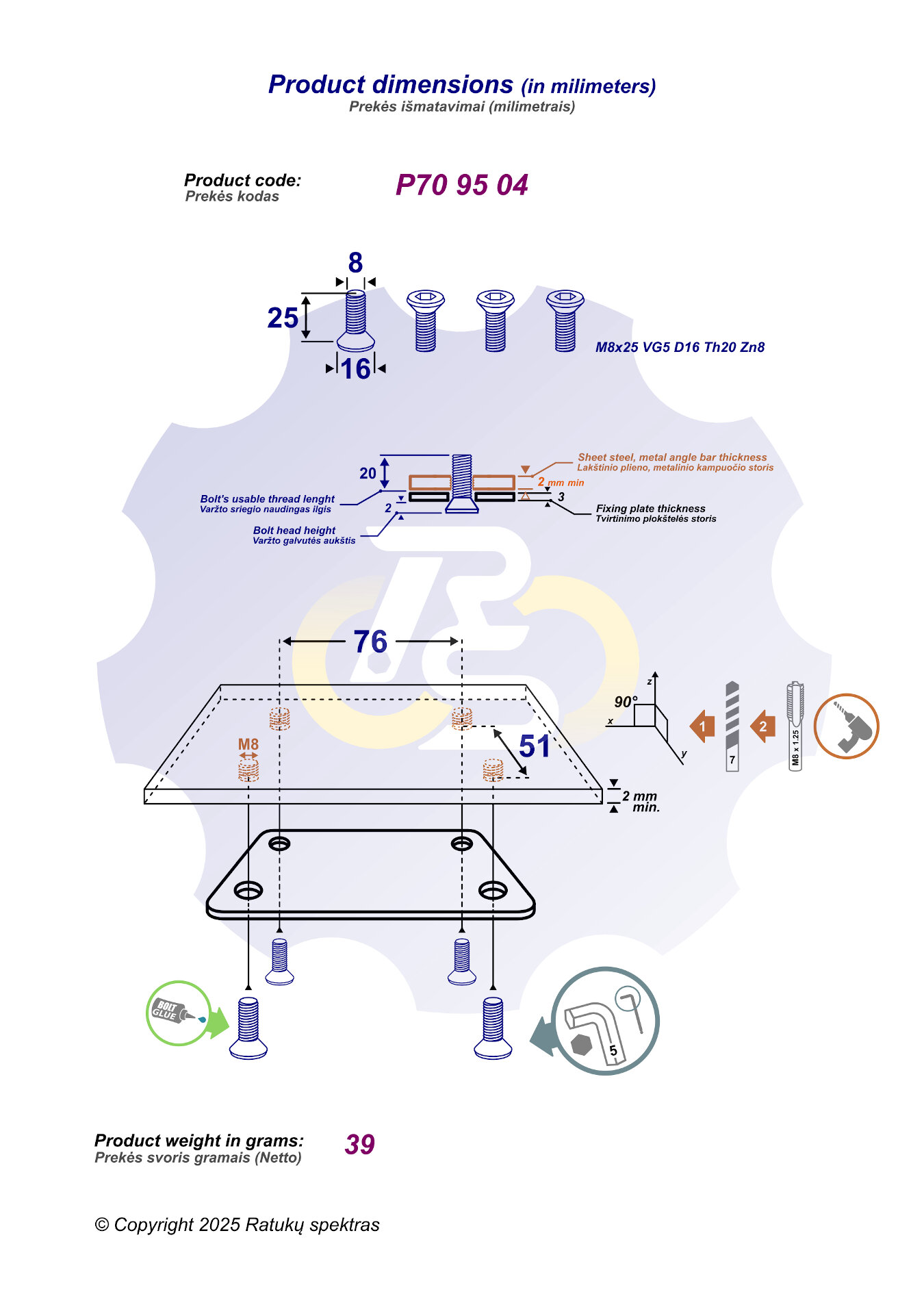 M8 x 25 mm Zn8 Varžtas įleidžiama galva. Sriegio ilgis 20 mm. Įrankis: šešiakampis L-formos 5 dydžio raktas.