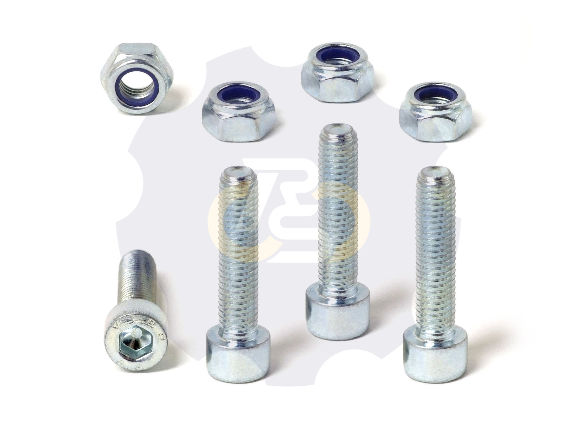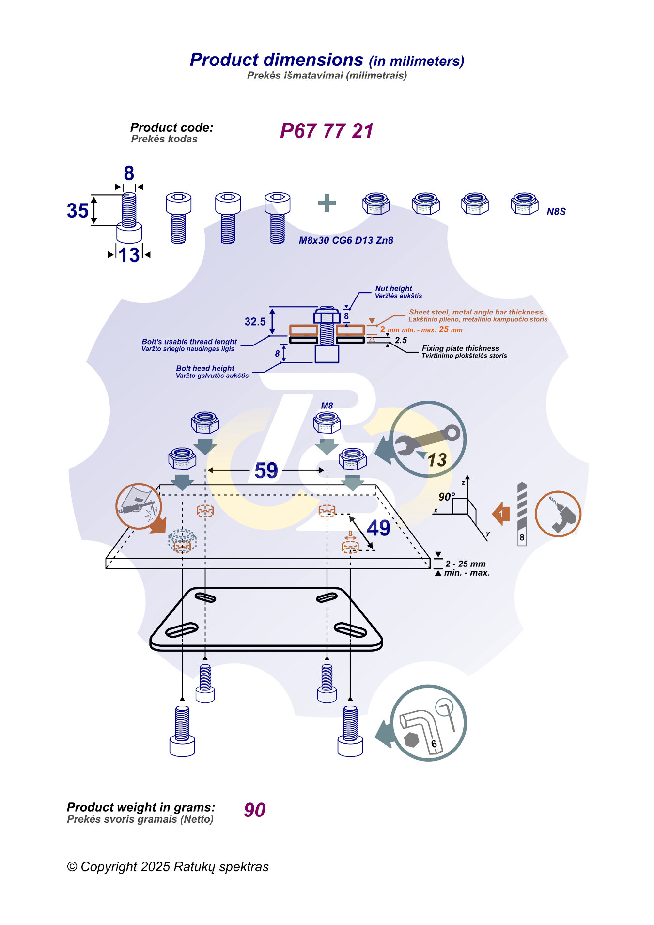 4 vienetai – M8 x 35 mm Zn8 Varžtas cilindrine galva D 13 mm, cinkuotas (galvutės aukštis 8 mm). Įrankis šešiakampis L-formos 6 dydžio raktas. + 4 vienetai – N8S veržlė M8x1.25 sriegiu, pagaminta iš plieno, cinkuota, su plastikiniu fiksavimo žiedu. Įrankis: veržliaraktis 13 dydžio.