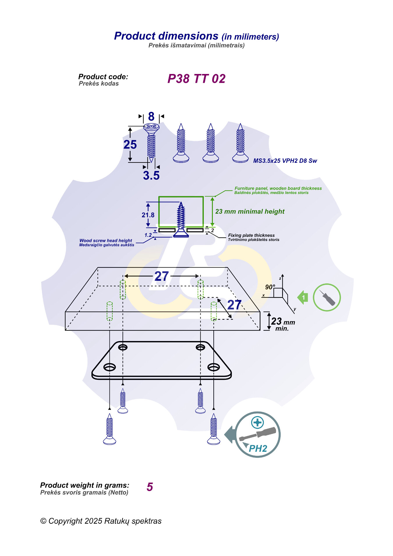 4 vienetai – WS 3.5 x 25 mm Sw Medsraigtis, įleidžiama galva, juodas. Įrankis: atsuktuvas PH2 galvute.