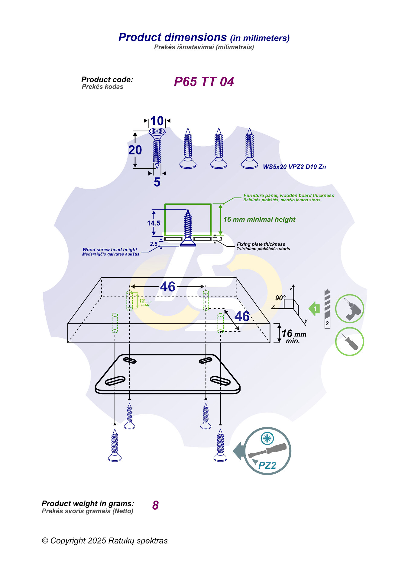 4 vienetai – WS 5 x 20 mm Zn Medsraigtis, įleidžiama galva. Įrankis: atsuktuvas PZ2 galvute.