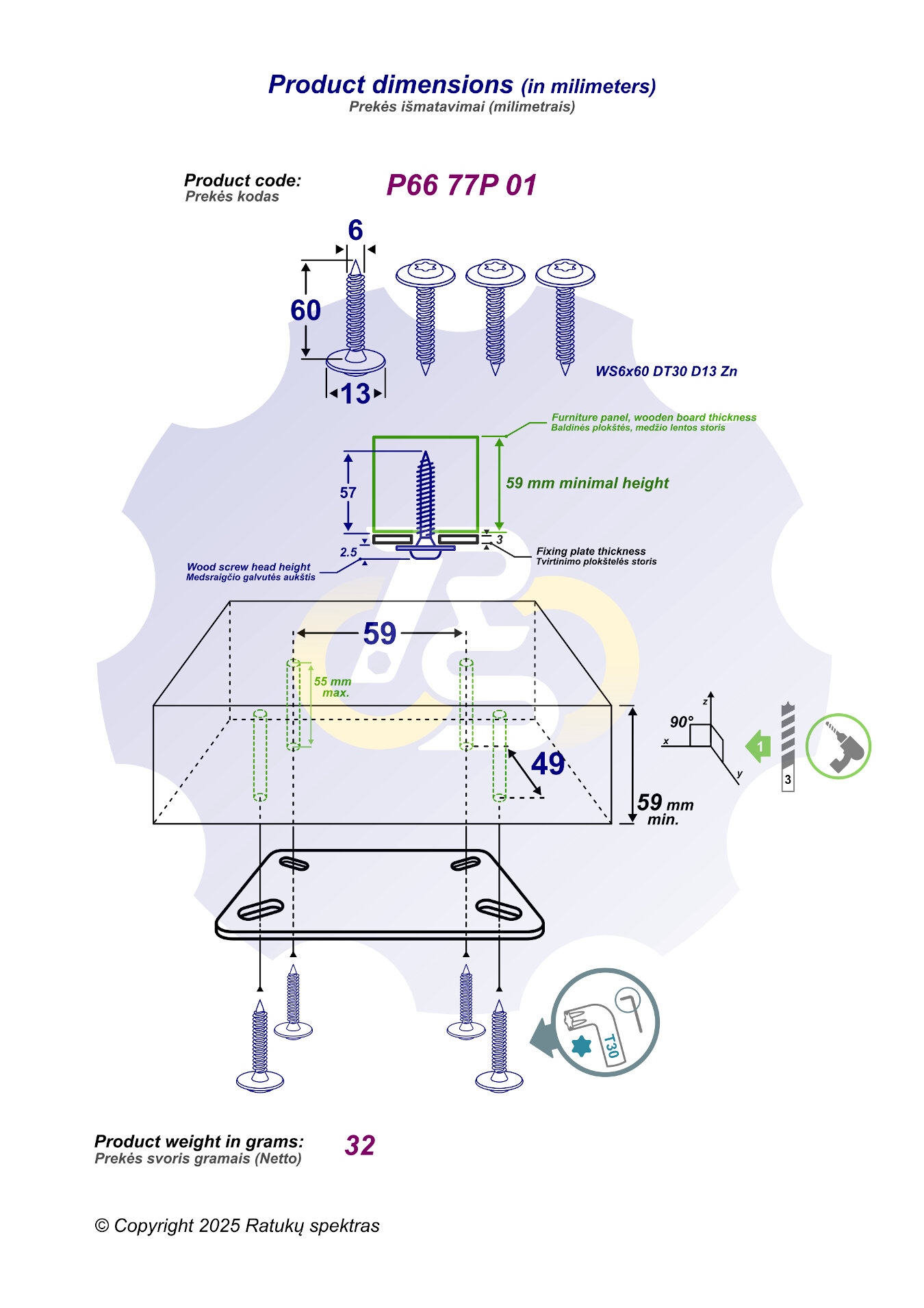 4 vienetai – WS 6 x 60 mm Zn Medsraigtis, plokščia galva. Įrankis: šešiakampės žvaigždės L-formos T30 dydžio raktas.