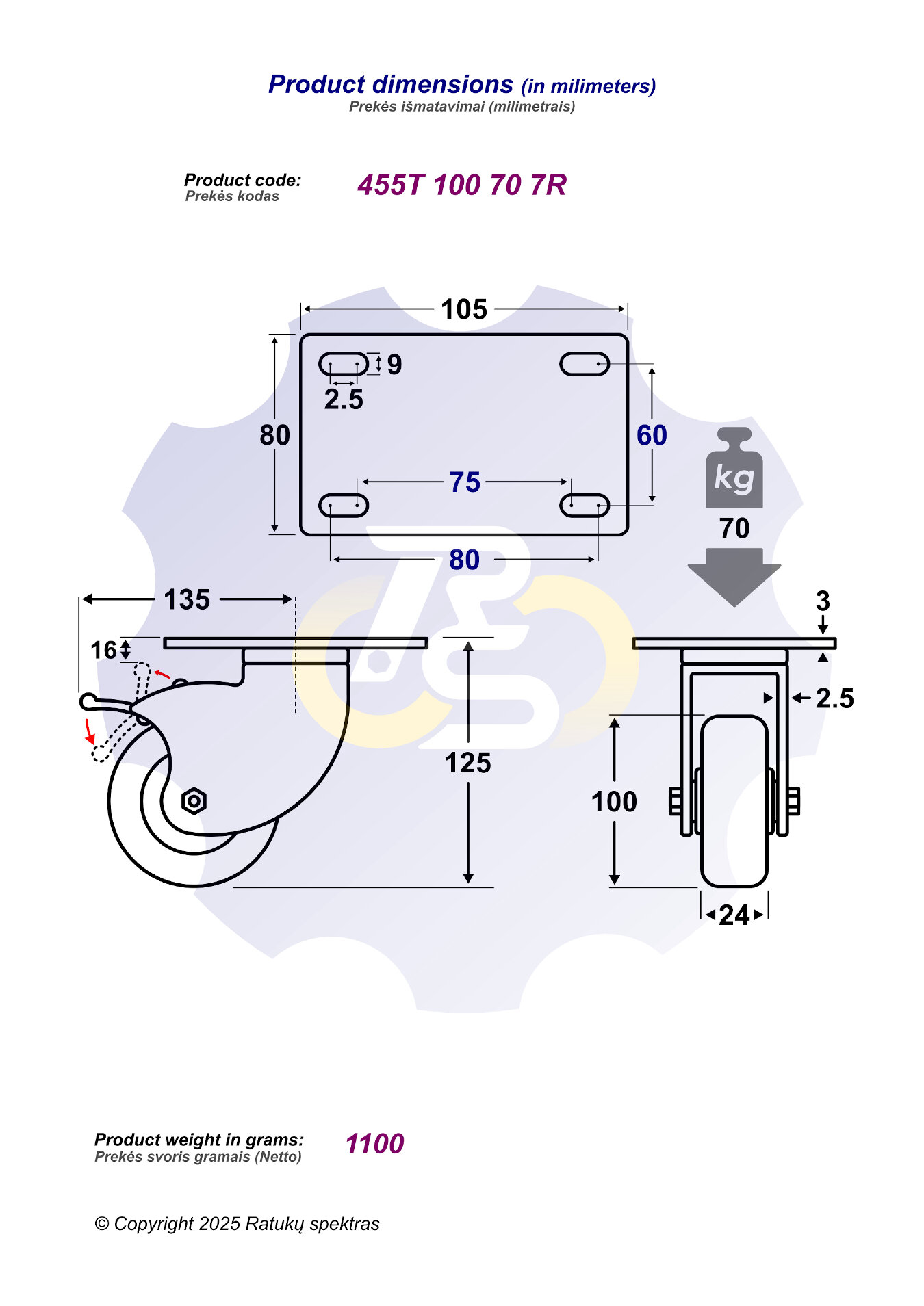 Juoda guma (85° Shore A) dengtas ratukas su cinkuoto plieno ratlankiu, ritininis guolis, pasukamas cinkuoto plieno kronšteinas (laikiklis) su dvejomis eilėmis atraminių guolių, su stabdžiu (fiksuoja ratuką ir kronšteiną), tvirtinimo plokštelė 105×80 mm, 4 tvirtinimo skylės – D 9 mm ovalo formos (ilgis 11.5 mm) – tvirtinimo skylių atstumas tarp centrų 80×60 mm – 75×60 mm. Rekomenduojame montavimo paviršiuje gręžti skyles atstumu 80×60 mm tarp centrų.