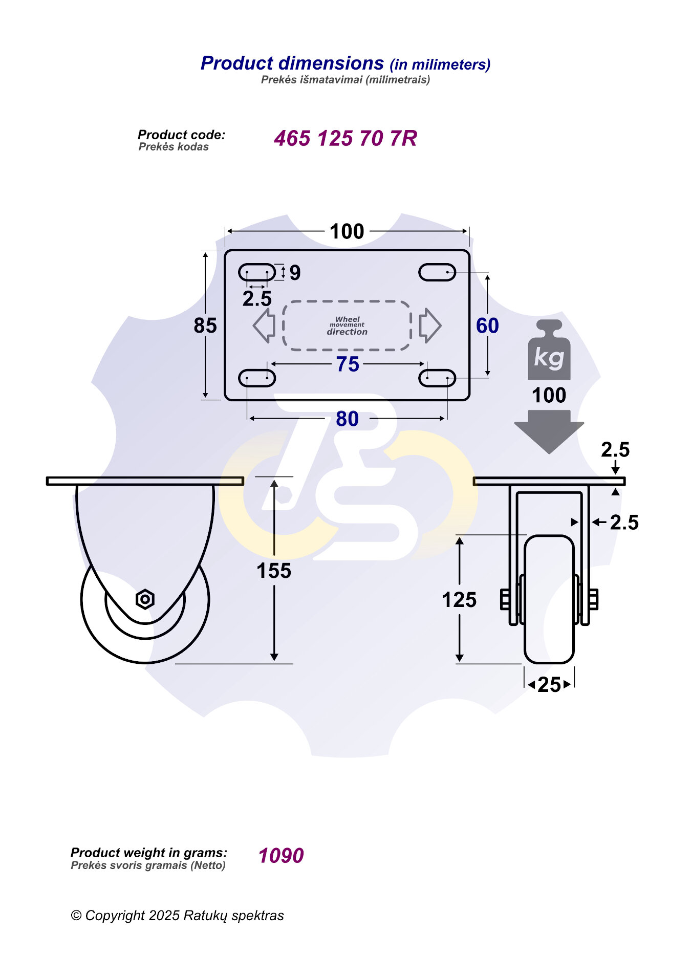 Juoda guma (85° Shore A) dengtas ratukas su cinkuoto plieno ratlankiu, ritininis guolis, fiksuotas (nepasukamas) cinkuoto plieno kronšteinas (laikiklis), tvirtinimo plokštelė 100×85 mm, 4 tvirtinimo skylės – D 9 mm ovalo formos (ilgis 11.5 mm) – tvirtinimo skylių atstumas tarp centrų 80×60 mm – 75×60 mm. Rekomenduojame montavimo paviršiuje gręžti skyles atstumu 80×60 mm tarp centrų.