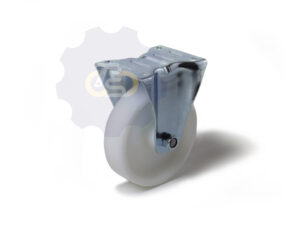Baltas polipropileno (PP) ratukas, slydimo guolis (įvorė), pasukamas cinkuoto plieno kronšteinas (laikiklis) su dvejomis eilėmis atraminių guolių, tvirtinimo plokštelė 105×80 mm, 4 tvirtinimo skylės – D 9 mm ovalo formos (ilgis 11.5 mm) – tvirtinimo skylių atstumas tarp centrų 80×60 mm – 75×60 mm. Rekomenduojame montavimo paviršiuje gręžti skyles atstumu 80×60 mm tarp centrų.