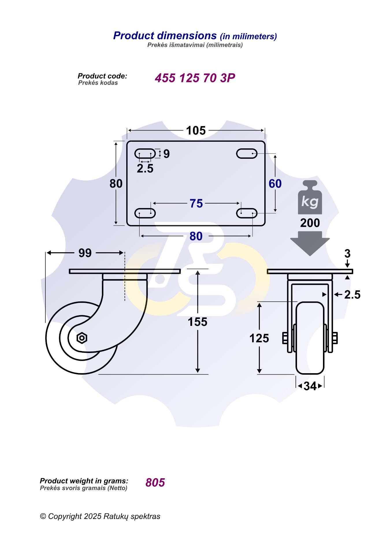 D125 H155 200KG Pasukamas ratukas su plokštele 105×80