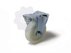 Baltas poliamido (PA) ratukas, rutulinis guolis su apsauga nuo dulkių, pasukamas cinkuoto plieno kronšteinas (laikiklis) su dvejomis eilėmis atraminių guolių, su stabdžiu (fiksuoja ratuką ir kronšteiną), tvirtinimo plokštelė 105×80 mm, 4 tvirtinimo skylės – D 9 mm ovalo formos (ilgis 11.5 mm) – tvirtinimo skylių atstumas tarp centrų 80×60 mm – 75×60 mm. Rekomenduojame montavimo paviršiuje gręžti skyles atstumu 80×60 mm tarp centrų.