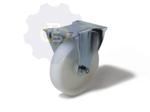 Baltas poliamido (PA) ratukas, slydimo guolis (įvorė), pasukamas cinkuoto plieno kronšteinas (laikiklis) su dvejomis eilėmis atraminių guolių, tvirtinimo plokštelė 135×110 mm, 4 tvirtinimo skylės – D 11 mm ovalo formos (ilgis 13.5 mm) – tvirtinimo skylių atstumas tarp centrų 105×80 mm – 105×75 mm. Rekomenduojame montavimo paviršiuje gręžti skyles atstumu 105×80 mm tarp centrų.