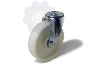 Baltas poliamido (PA) ratukas, rutulinis guolis, pasukamas cinkuoto plieno kronšteinas (laikiklis) su dvejomis eilėmis atraminių guolių, su stabdžiu (fiksuoja ratuką ir kronšteiną), tvirtinimo skylė D12.5 mm (tvirtinamas vienu varžtu M12)