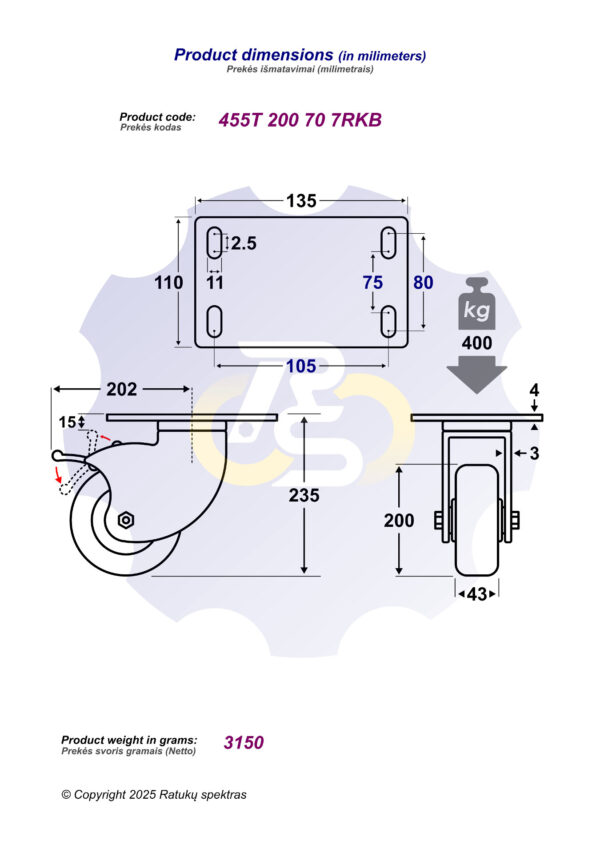 D200 H235 400KG Pasukamas ratukas su stabdžiu, su plokštele 135×110