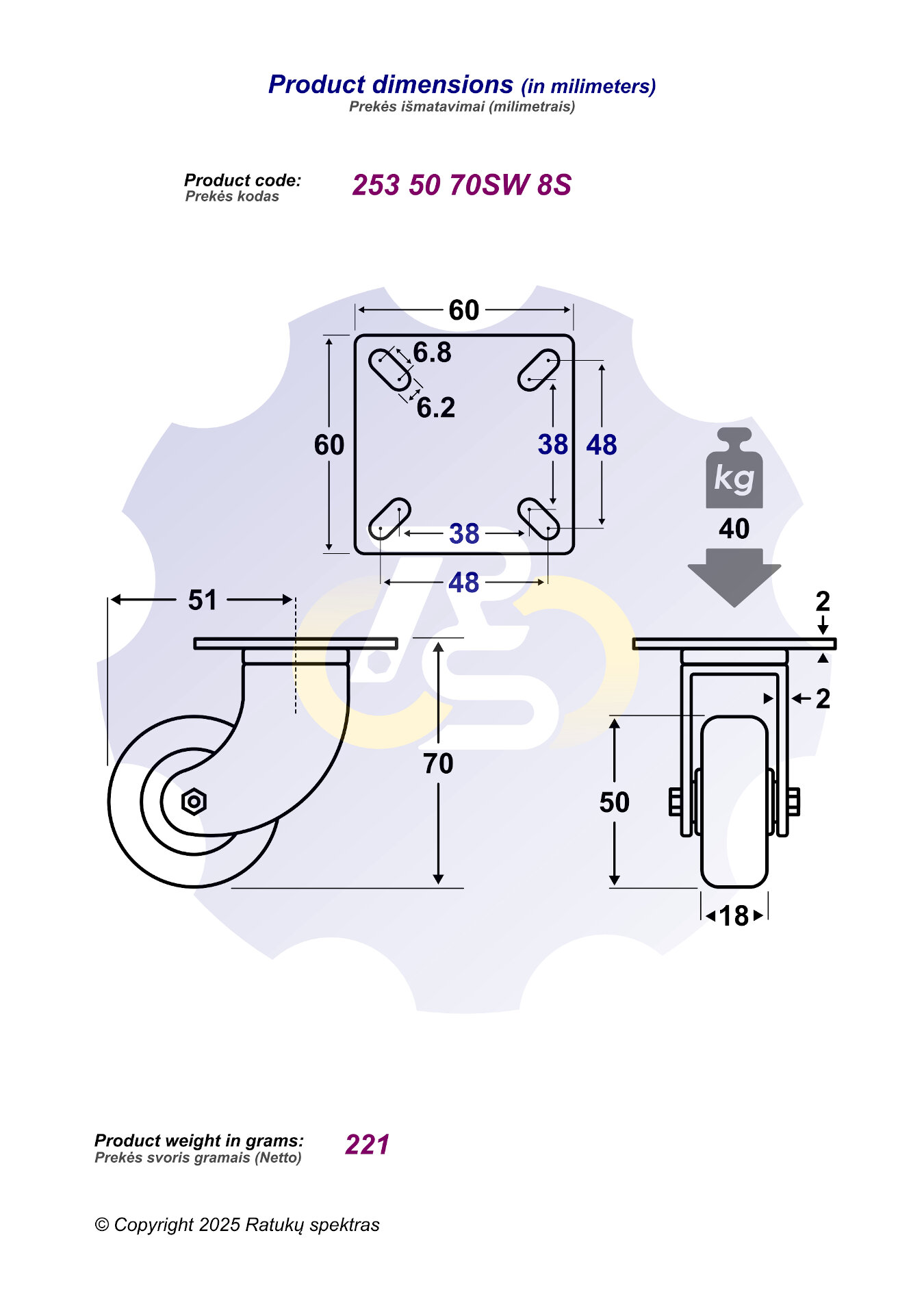 PVC guma (85° Shore A) dengtas ratukas iš polipropileno (PP), slydimo guolis (įvorė – varžtas), juodos spalvos pasukamas cinkuoto plieno kronšteinas (laikiklis) su dvejomis eilėmis atraminių guolių, tvirtinimo plokštelė 60×60 mm, 4 tvirtinimo skylės – D 6.2 mm ovalo formos (ilgis 13 mm) – tvirtinimo skylių atstumas tarp centrų 48×48 mm – 38×38 mm. Rekomenduojame grežti skyles atstumu 46×46 mm tarp centrų.