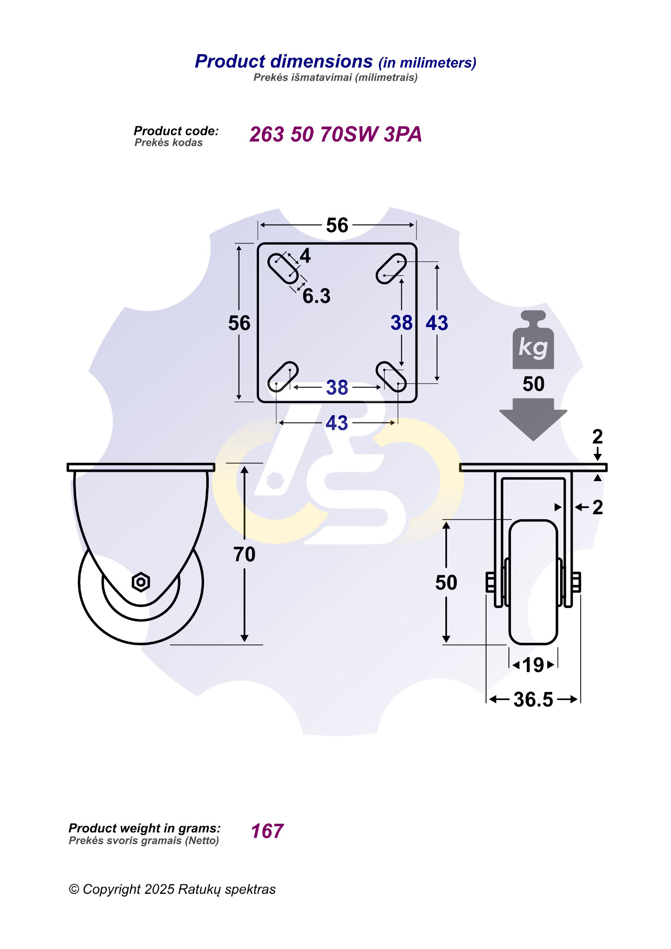 D50 H70 50KG Fiksuotas ratukas su plokštele 56×56