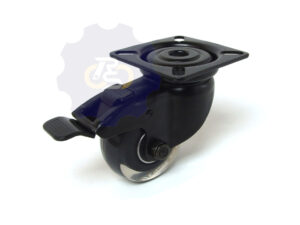 PVC guma (85° Shore A) dengtas ratukas iš polipropileno (PP), du rutuliniai guoliai, juodos spalvos pasukamas cinkuoto plieno kronšteinas (laikiklis) su dvejomis eilėmis atraminių guolių, tvirtinimo plokštelė 60×60 mm, 4 tvirtinimo skylės – D 6.2 mm ovalo formos (ilgis 13 mm) – tvirtinimo skylių atstumas tarp centrų 48×48 mm – 38×38 mm. Rekomenduojame grežti skyles atstumu 46×46 mm tarp centrų.