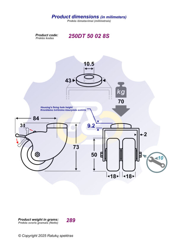 Dvigubas, PVC guma (85° Shore A) dengtas ratukas iš polipropileno (PP), slydimo guolis (įvorė – varžtas), pasukamas cinkuoto plieno kronšteinas (laikiklis) su dvejomis eilėmis atraminių guolių, su stabdžiu (fiksuoja ratuką ir kronšteiną), tvirtinimo skylė D10.5 mm (tvirtinamas vienu varžtu M10)