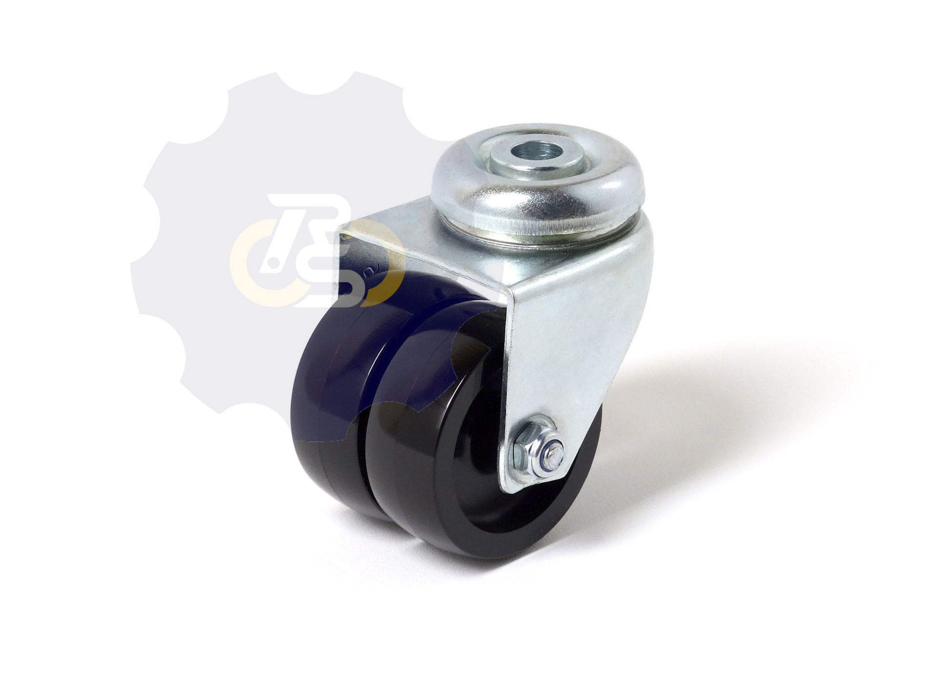 Dvigubas, juodo poliamido (PA) ratukas, slydimo guolis (įvorė – varžtas), pasukamas cinkuoto plieno kronšteinas (laikiklis) su dvejomis eilėmis atraminių guolių, tvirtinimo skylė D10.5 mm (tvirtinamas vienu varžtu M10)