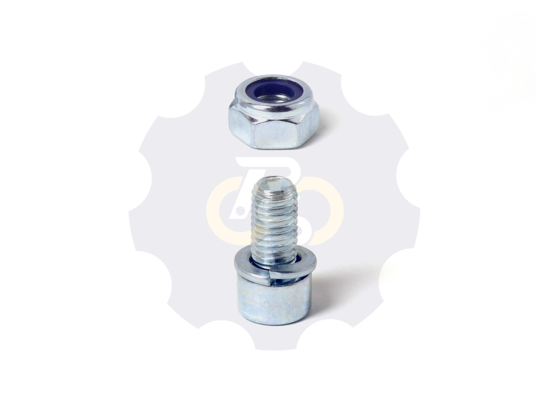 M10 x 20 mm Zn8 Varžtas cilindrine galva + spyruoklinė poveržlė 2 mm storio (G17/10). Įrankis: šešiakampis L-formos 8 dydžio raktas. + N10S veržlė M10x1.50 sriegiu, pagaminta iš plieno, cinkuota, su plastikiniu fiksavimo žiedu. Įrankis: veržliaraktis 17 dydžio.