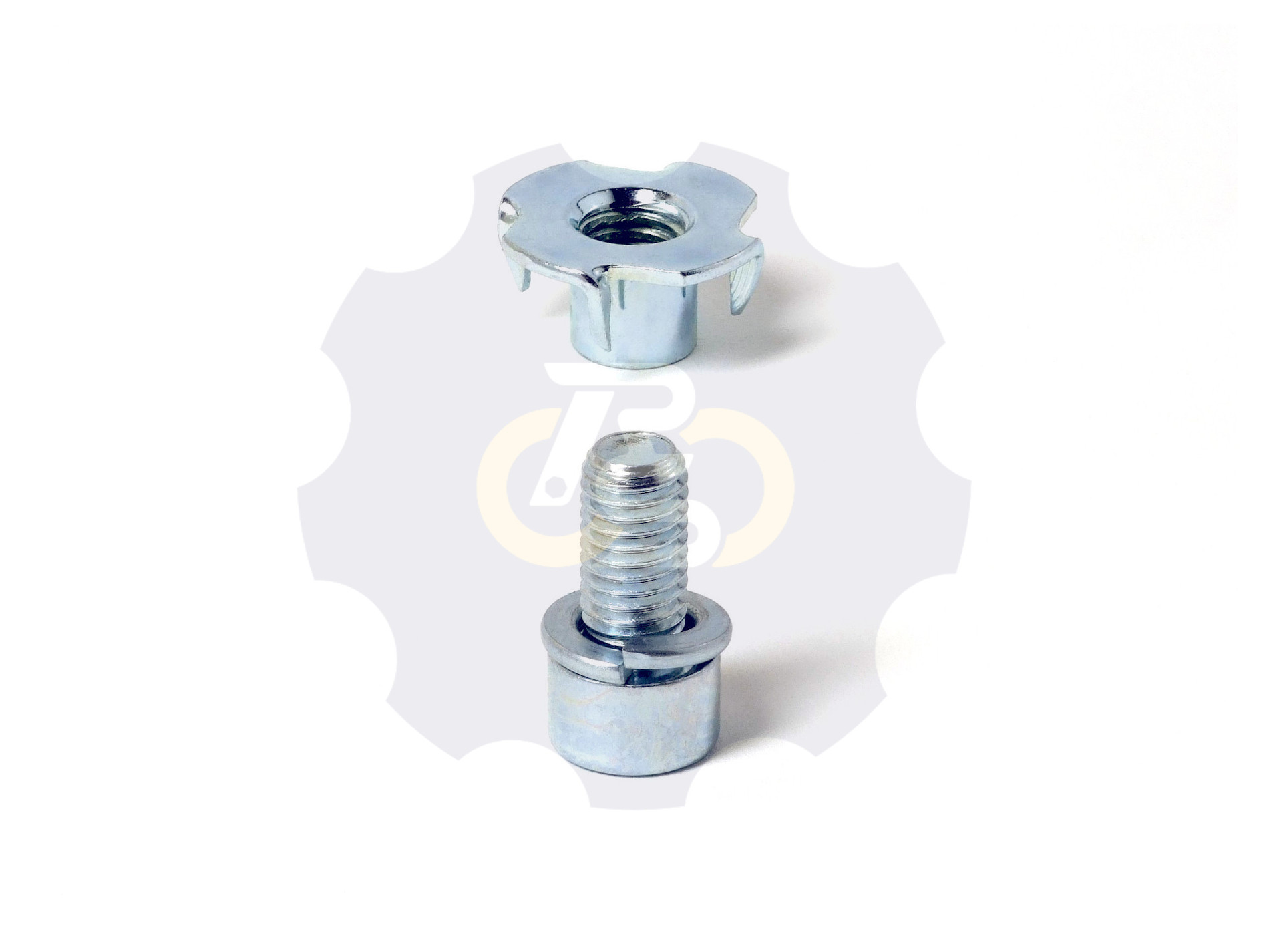 M10 x 20 mm Zn8 Varžtas cilindrine galva + spyruoklinė poveržlė 2 mm storio (G17/10). Įrankis: šešiakampis L-formos 8 dydžio raktas. + NE M10 x 13 mm Zn Įkalama veržlė, cinkuota, bendras aukštis 13 mm, skersmuo 11 mm. Sriegio gylis 13 mm, kepurėles plotis 25 mm, kepurėlės storis 1.6 mm. Skylę gręžti – 11 mm.