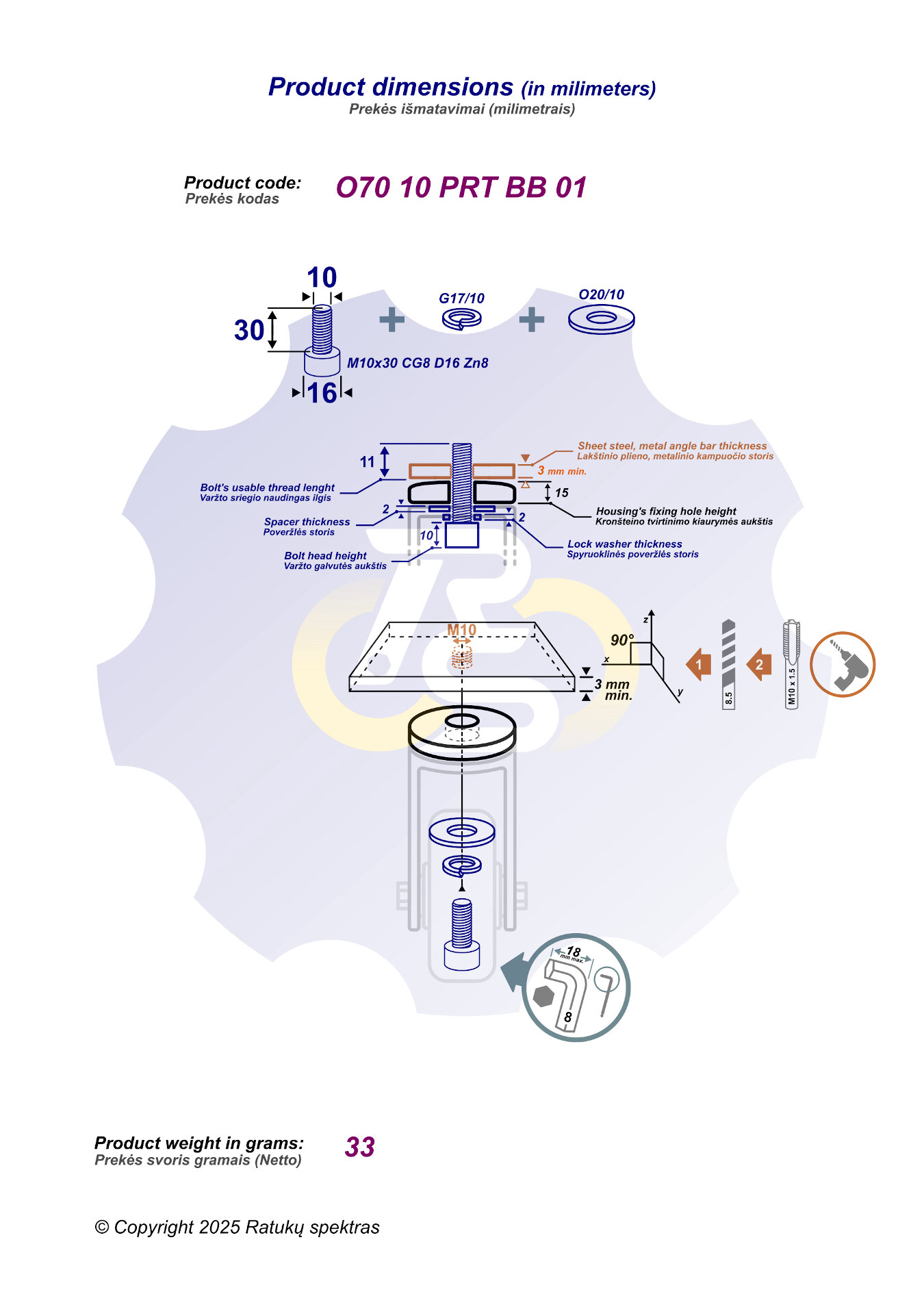 M10 x 30 mm Zn8 Varžtas cilindrine galva + spyruoklinė poveržlė 2 mm storio (G17/10) + poveržlė 2 mm storio (O20/10). Įrankis: šešiakampis L-formos 8 dydžio raktas.