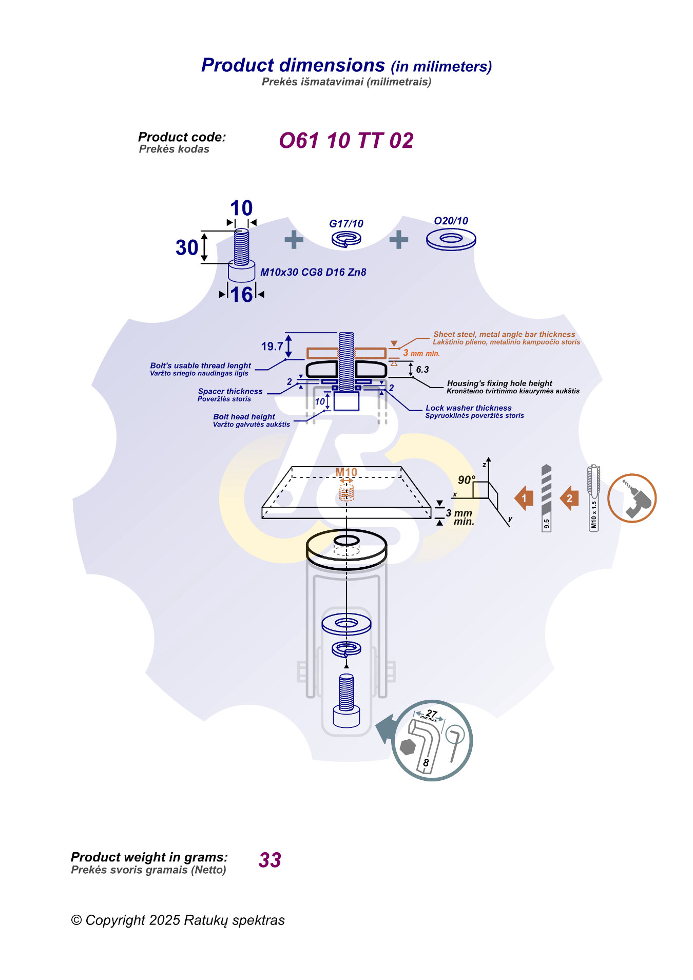 M10 x 30 mm Zn8 Varžtas cilindrine galva + spyruoklinė poveržlė 2 mm storio (G17/10) + poveržlė 2 mm storio (O20/10). Įrankis: šešiakampis L-formos 8 dydžio raktas.