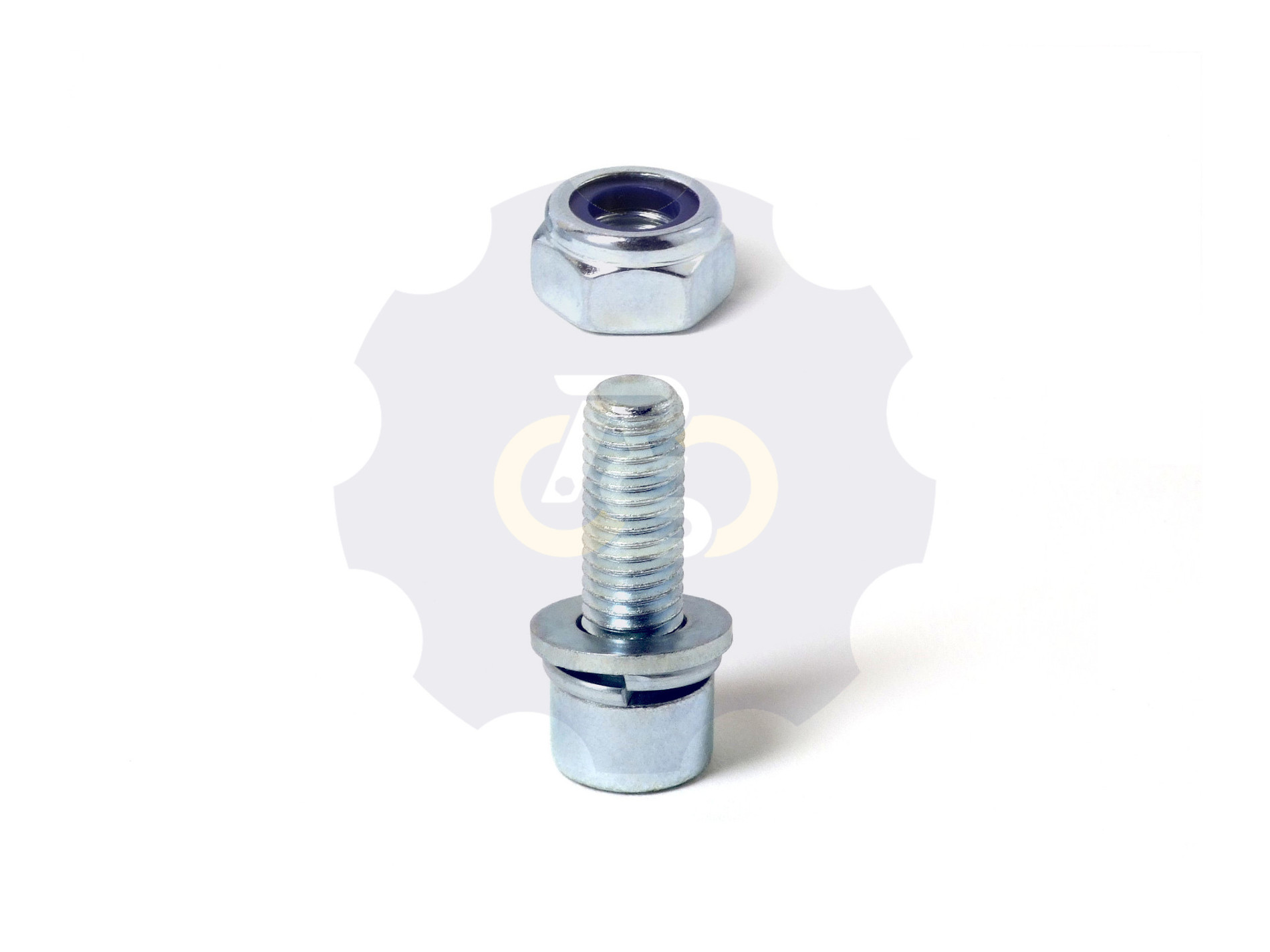 M10 x 30 mm Zn8 Varžtas cilindrine galva + spyruoklinė poveržlė 2 mm storio (G17/10) + poveržlė 2 mm storio (O20/10). Įrankis: šešiakampis L-formos 8 dydžio raktas. + N10S veržlė M10x1.50 sriegiu, pagaminta iš plieno, cinkuota, su plastikiniu fiksavimo žiedu. Įrankis: veržliaraktis 17 dydžio.