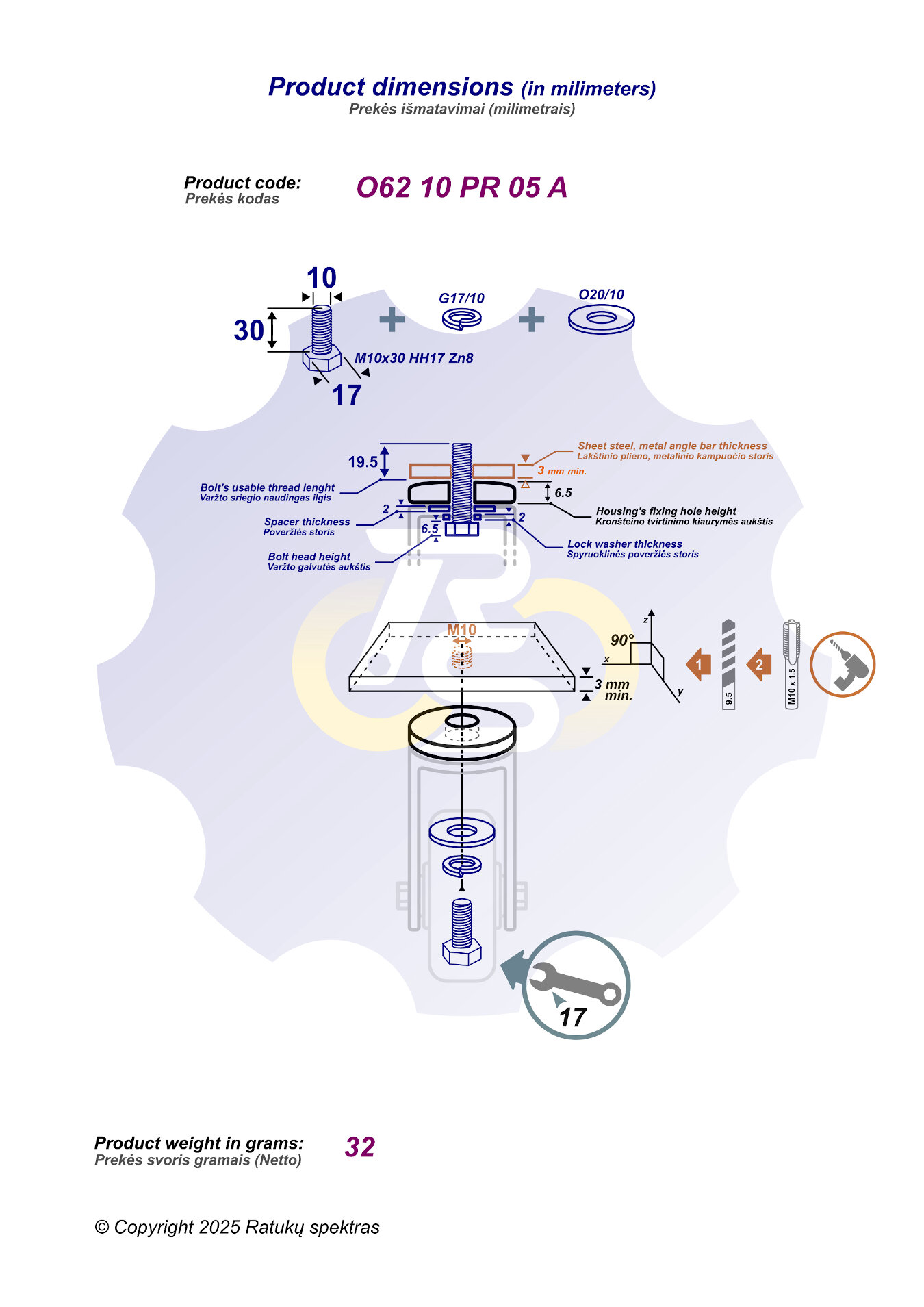 M10 x 30 mm Zn Varžtas šešiakampe galva, cinkuotas + spyruoklinė poveržlė 2 mm storio (G17/10) + poveržlė 2 mm storio (O20/10). Įrankis: šešiakampis veržliaraktis 17 dydžio.