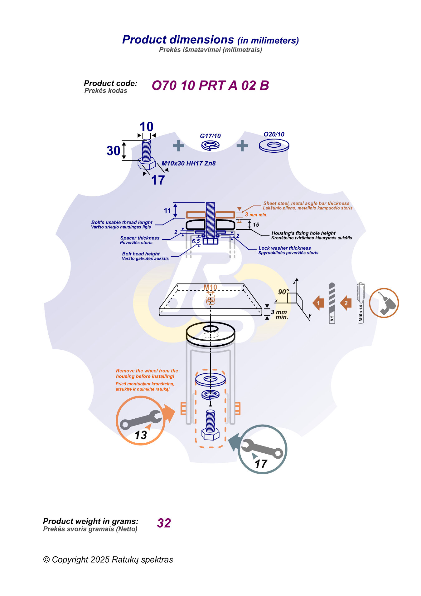 M10 x 30 mm Zn Varžtas šešiakampe galva, cinkuotas + spyruoklinė poveržlė 2 mm storio (G17/10) + poveržlė 2 mm storio (O20/10). Įrankis: šešiakampis veržliaraktis 17 dydžio.