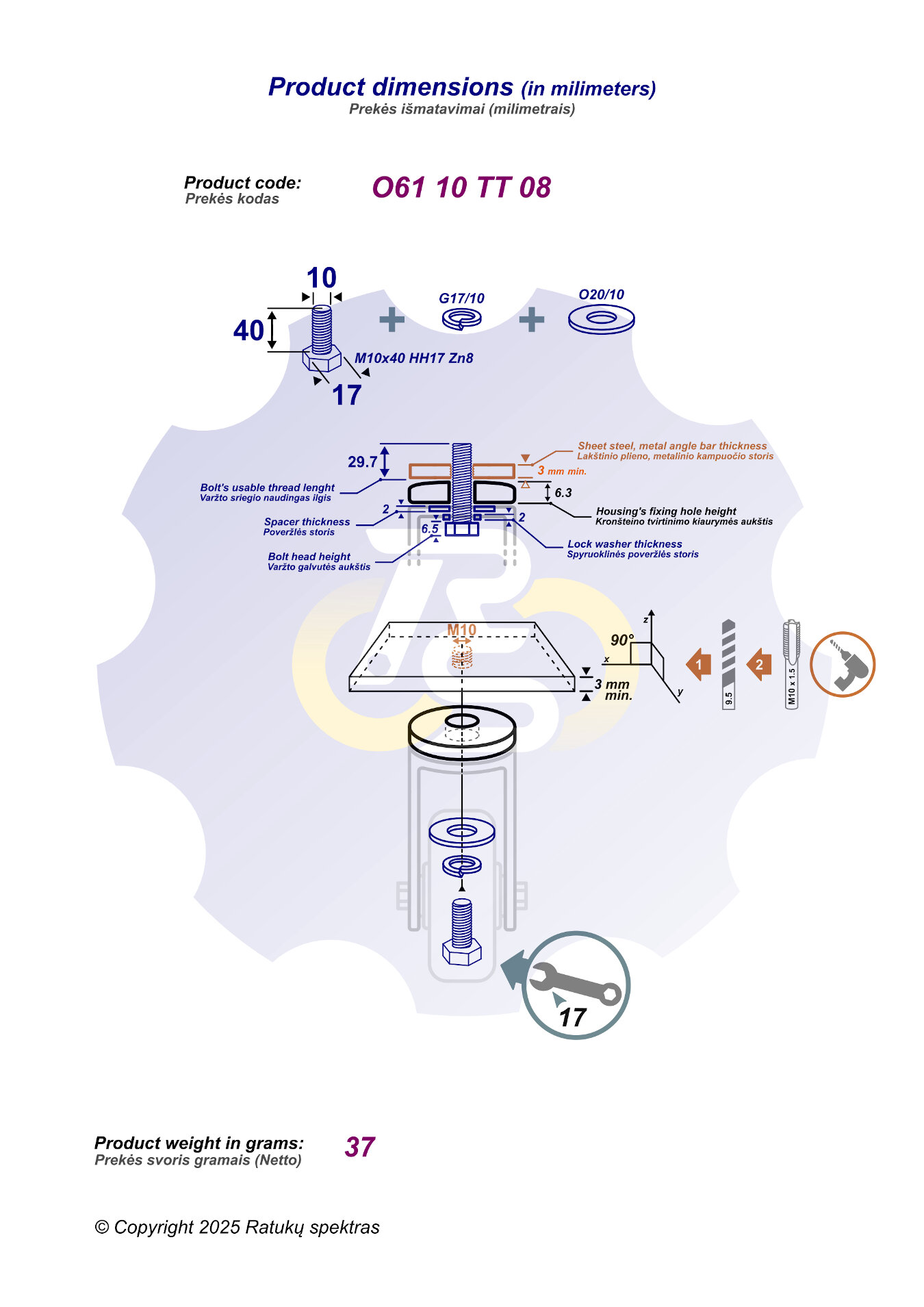 M10 x 40 mm Zn8 Varžtas šešiakampe galva, cinkuotas + spyruoklinė poveržlė 2 mm storio (G17/10) + poveržlė 2 mm storio (O20/10). Įrankis: šešiakampis veržliaraktis 17 dydžio.
