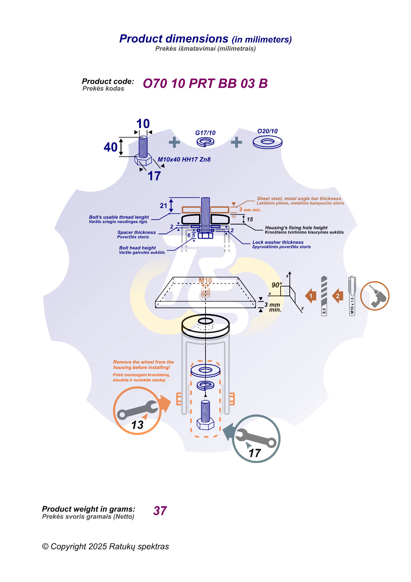 M10 x 40 mm Zn8 Varžtas šešiakampe galva, cinkuotas + spyruoklinė poveržlė 2 mm storio (G17/10) + poveržlė 2 mm storio (O20/10). Įrankis: šešiakampis veržliaraktis 17 dydžio.