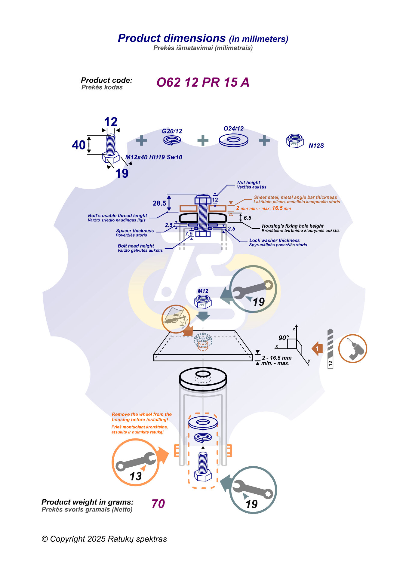 M12 x 40 mm Sw10 Varžtas šešiakampe galva, juodas + spyruoklinė poveržlė 2.5 mm storio (G20/12) + poveržlė 2.5 mm storio (O24/12). Įrankis: šešiakampis veržliaraktis 19 dydžio. + N12S veržlė M12x1.75 sriegiu, pagaminta iš plieno, cinkuota, su plastikiniu fiksavimo žiedu. Įrankis: veržliaraktis 19 dydžio.