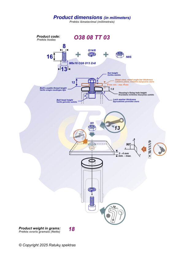 M8 x 16 mm Zn8 Varžtas cilindrine galva + spyruoklinė poveržlė 2 mm storio (G14/8). Įrankis: šešiakampis L-formos 6 dydžio raktas. + N8S veržlė M8x1.25 sriegiu, pagaminta iš plieno, cinkuota, su plastikiniu fiksavimo žiedu. Įrankis: veržliaraktis 13 dydžio.