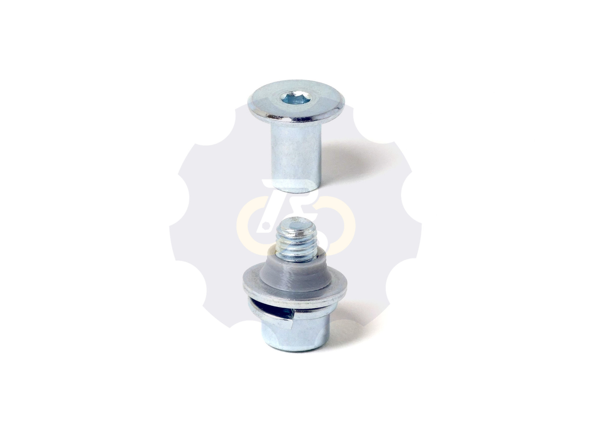 M8 x 16 mm Zn8 Varžtas cilindrine galva + spyruoklinė poveržlė 2 mm storio (G14/8) + poveržlė 2 mm storio (O20/10) + RS10/8-253 sumažinimo įvorė. Įrankis: šešiakampis L-formos 6 dydžio raktas. + NT M8 x 16 mm Zn T-formos veržlė, cinkuota, bendras aukštis 18 mm, skersmuo 10 mm. Sriegio gylis 12 mm, kepurėlės diametras 19 mm, kepurėlės storis 2 mm. Įrankis: šešiakampis L-formos 5 dydžio raktas.