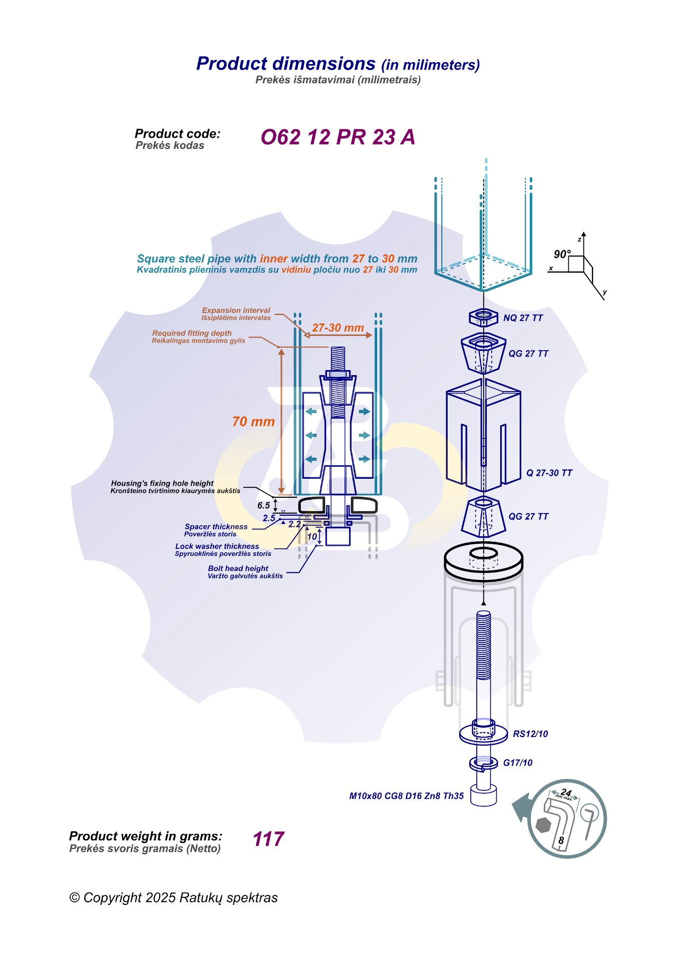 Išsiplečiantis tvirtinimas kvadratiniam vamzdžiui vidiniu skersmeniu nuo 27 iki 30 mm. Komplektą sudaro: plastikinė mova (Q27-30TT) – 1 vnt., kūgelis (QG27TT) – 2 vnt., veržlė (NQ27TT) – 1 vnt., kiaurymės sumažinimo įvorė (RS12/10) – 1 vnt., spyruoklinė poveržlė (G17/10) – 1 vnt., varžtas (M10x80 Th35) – 1 vnt. Įrankis: šešiakampis L-formos 8 dydžio raktas – į komplektą neįeina